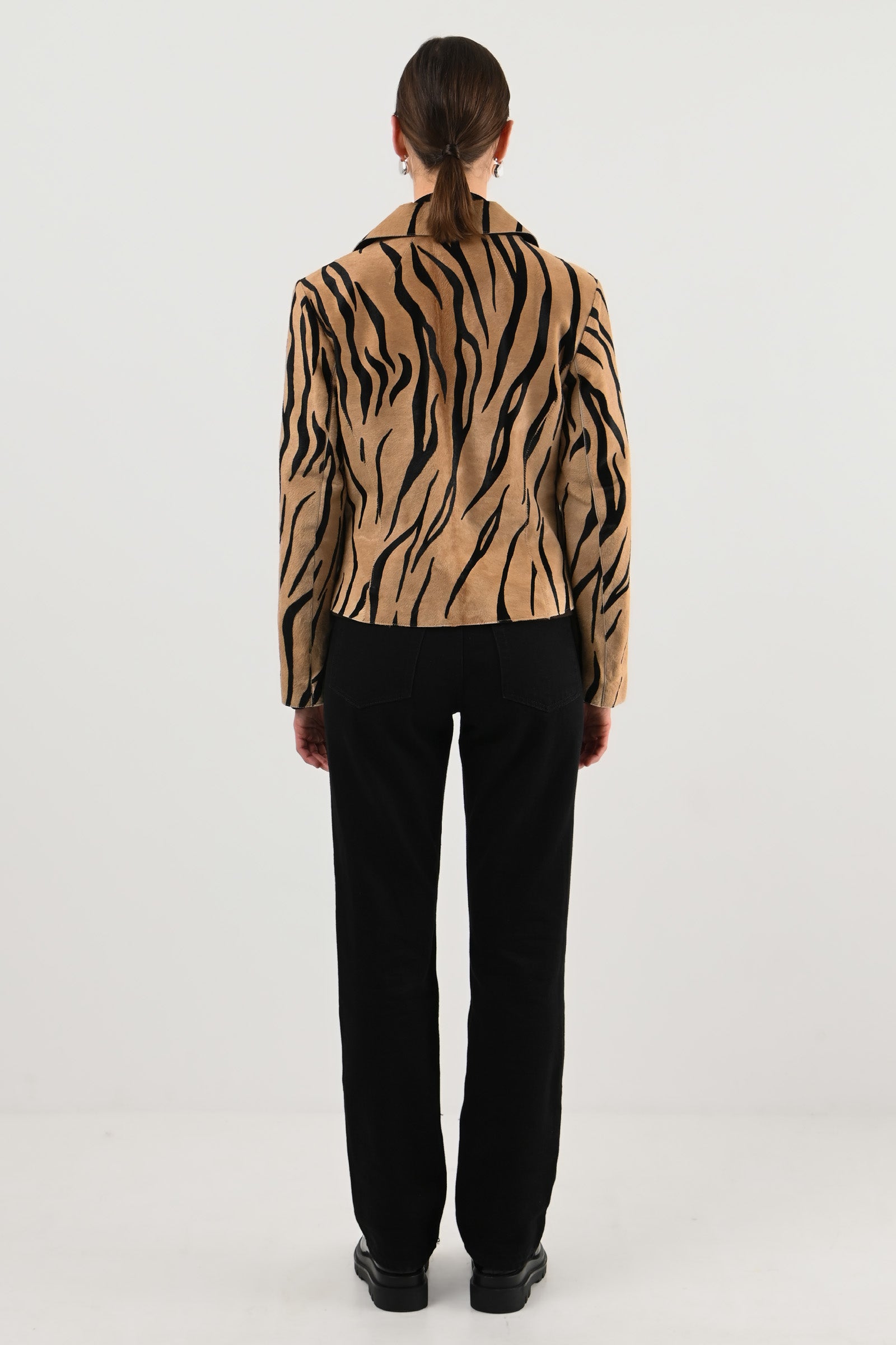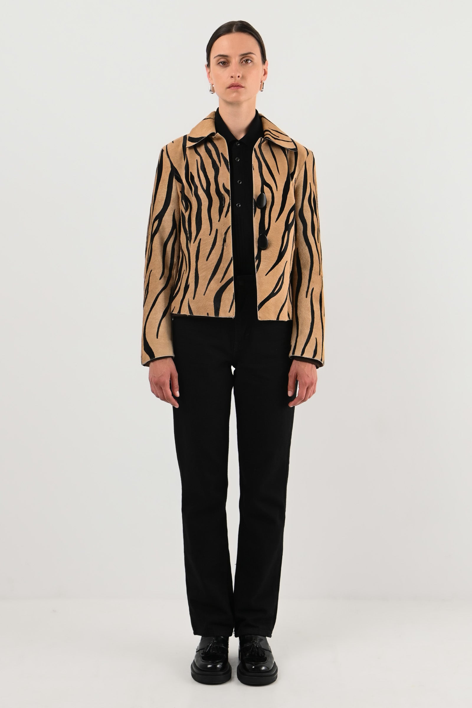 Veste en vachette imprimée façon tigre, coupe droite à col cranté et boutons noirs contrastants.