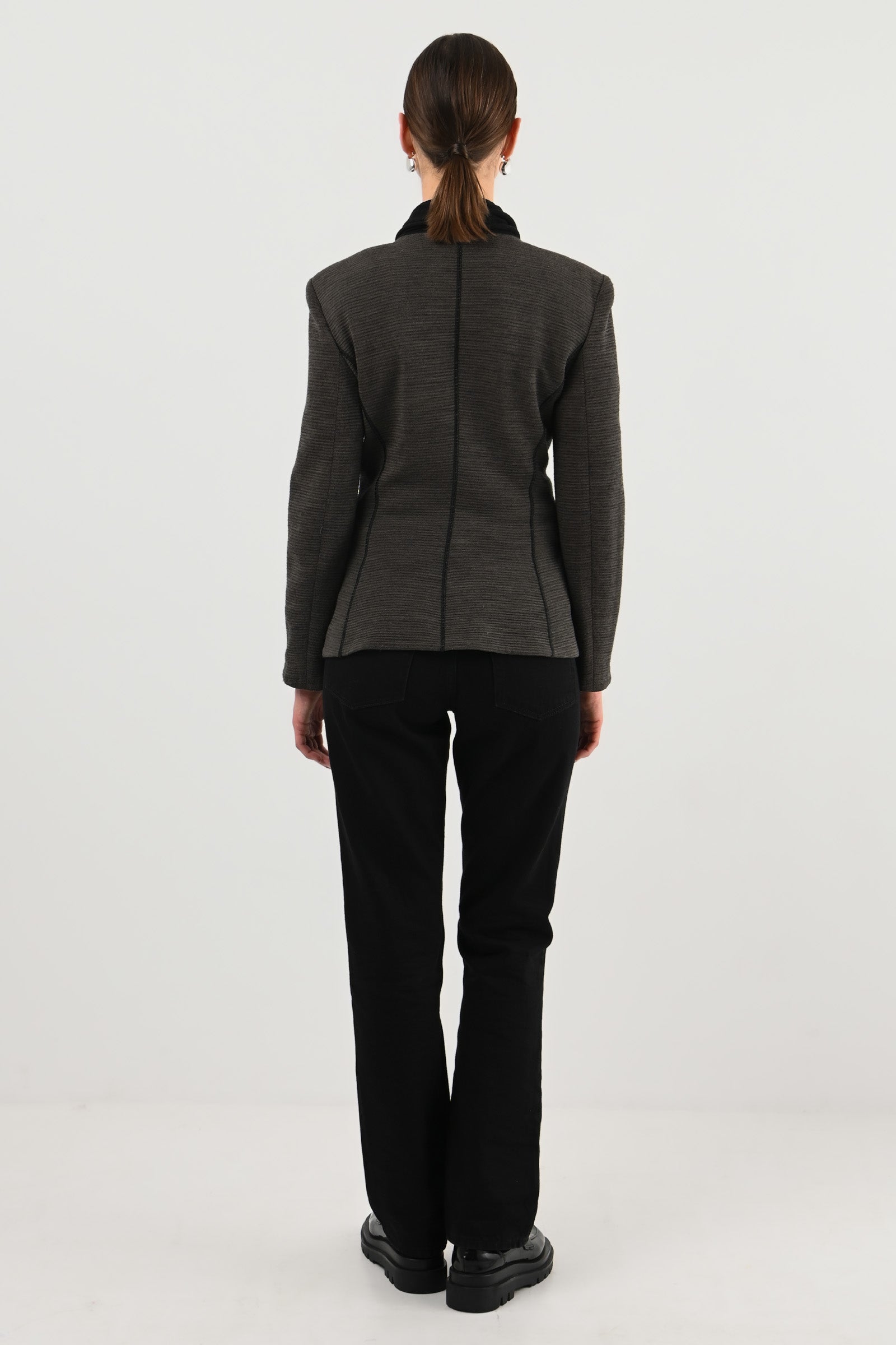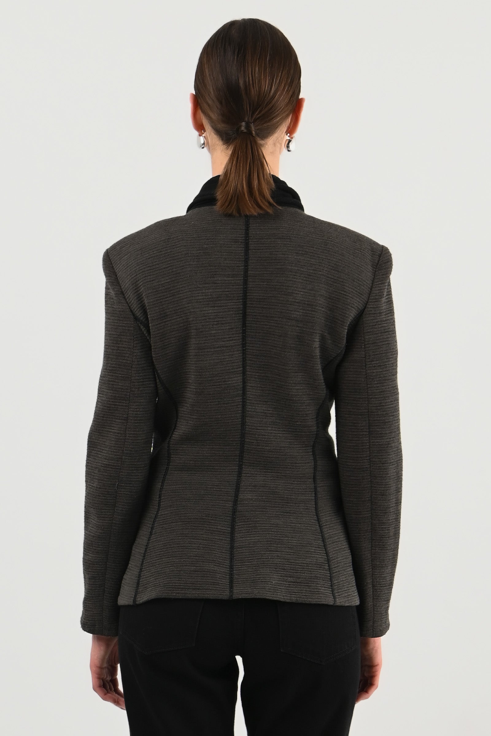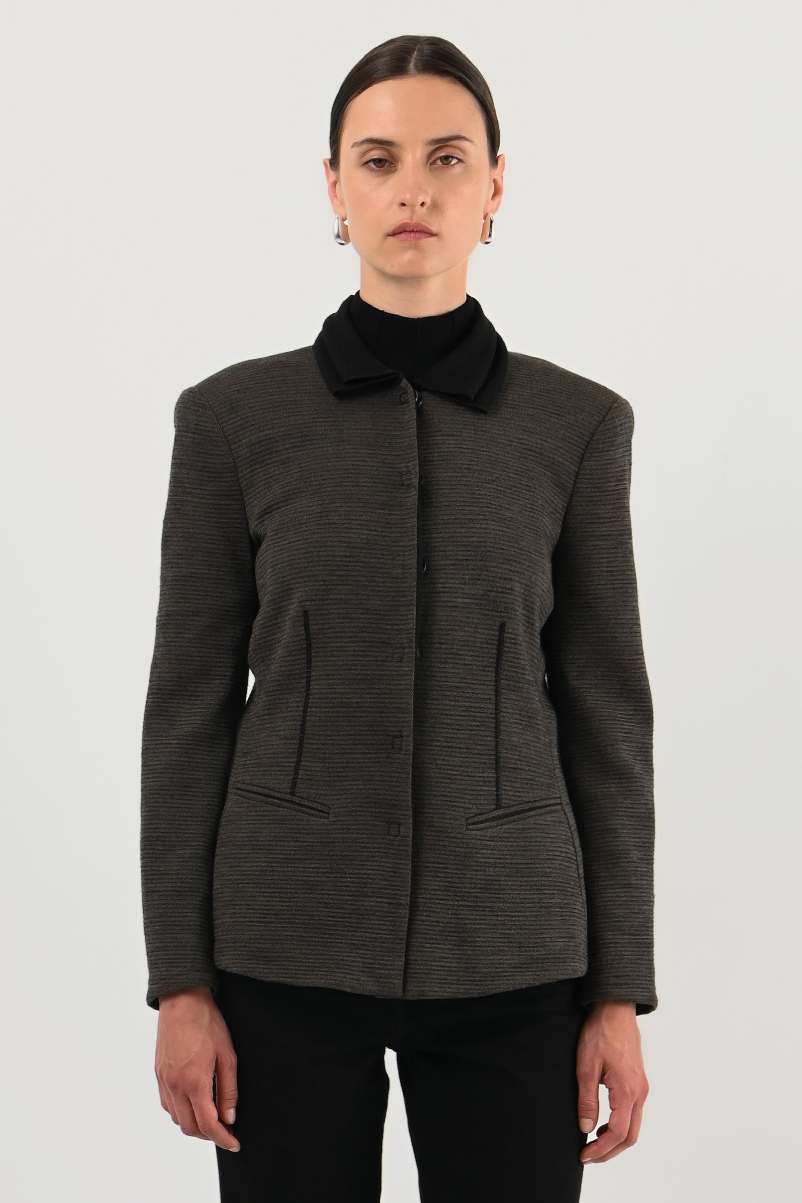 Veste structurée en laine anthracite texturée à fines rayures, double col contrastant noir et anthracite, poches passepoilées verticales.