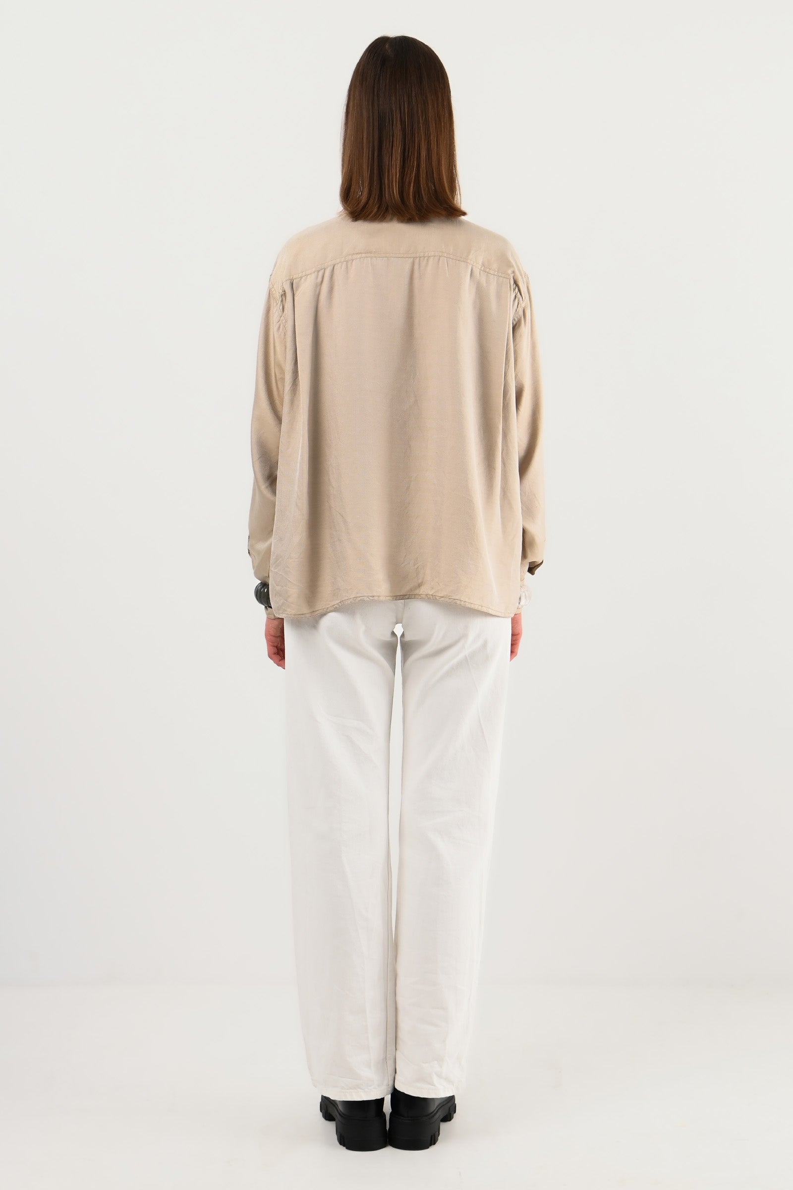 Chemise beige à poches, fermée par des boutons siglés Chanel. Allure décontractée chic.