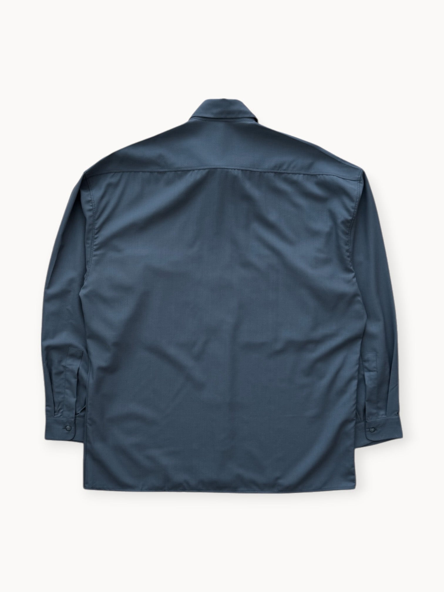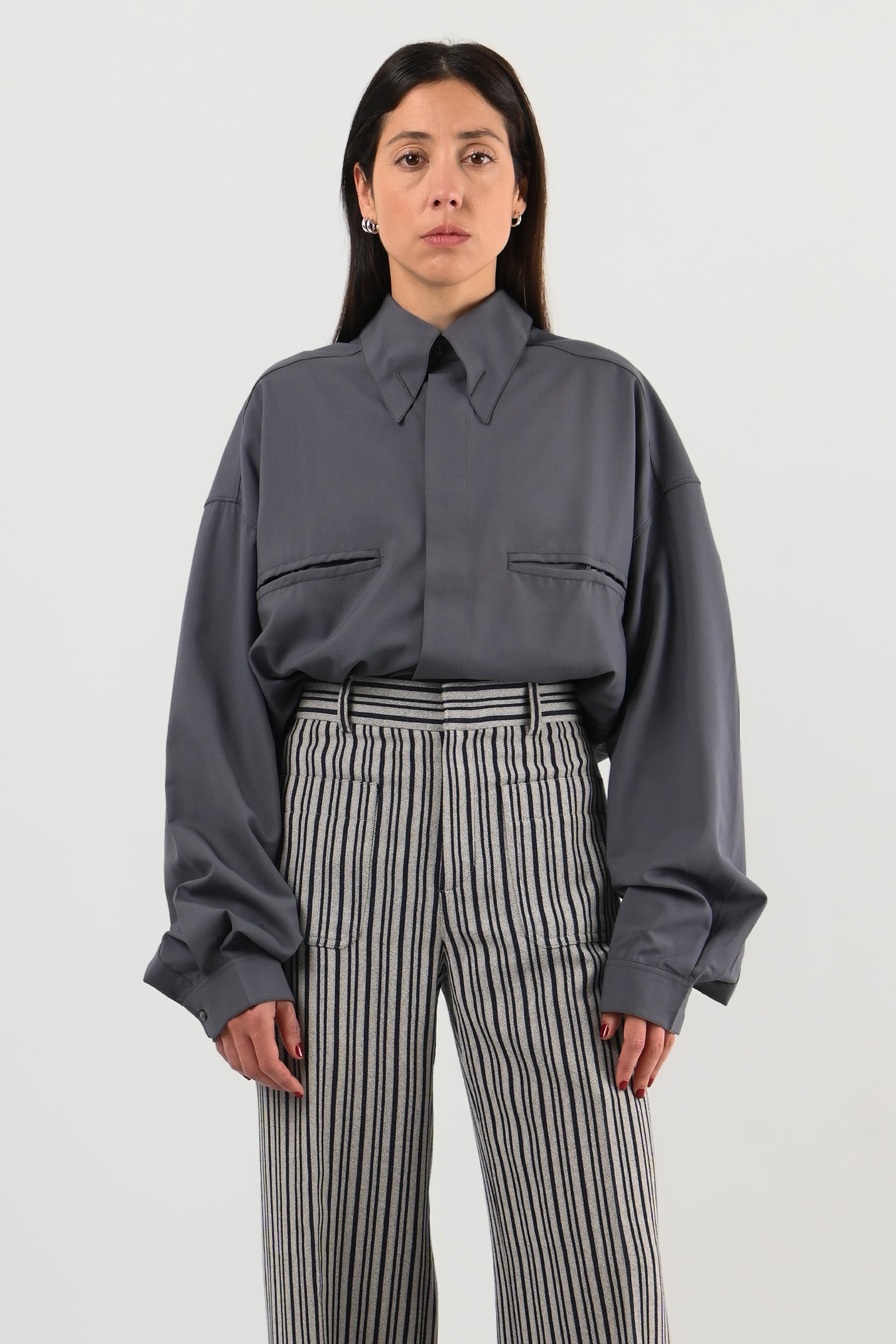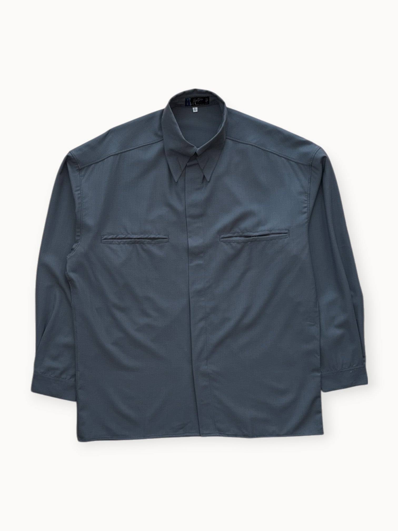 Chemise en laine gris ardoise, coupe ample et structurée, col pointu signature. Esthétique sculpturale typique de Montana.
