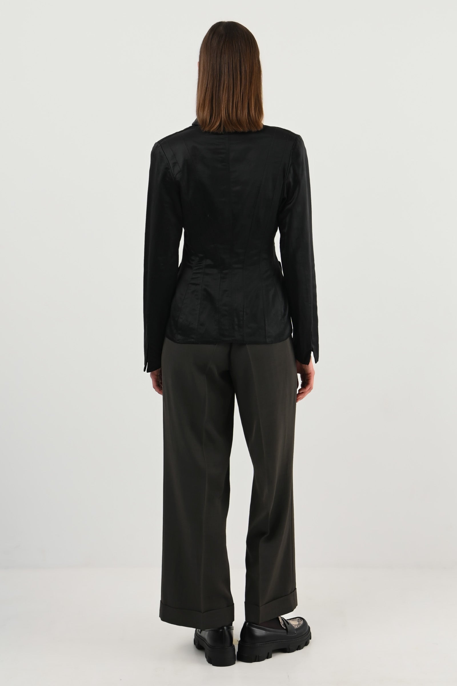 Veste cintrée en soie noire fluide, coupe près du corps et détails minimalistes. Icône de l’ère Tom Ford chez Gucci