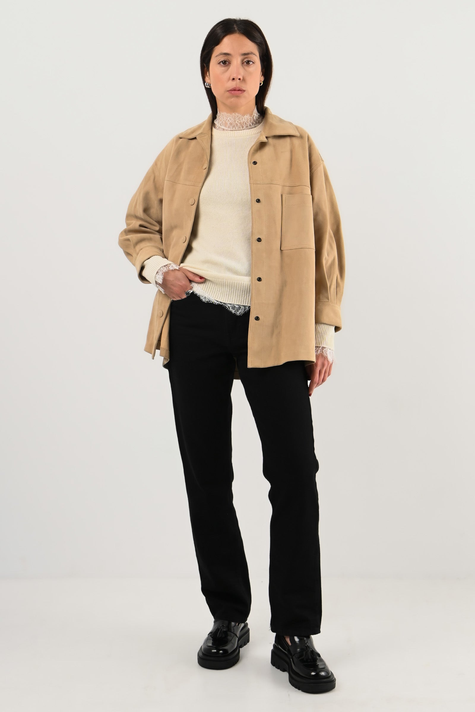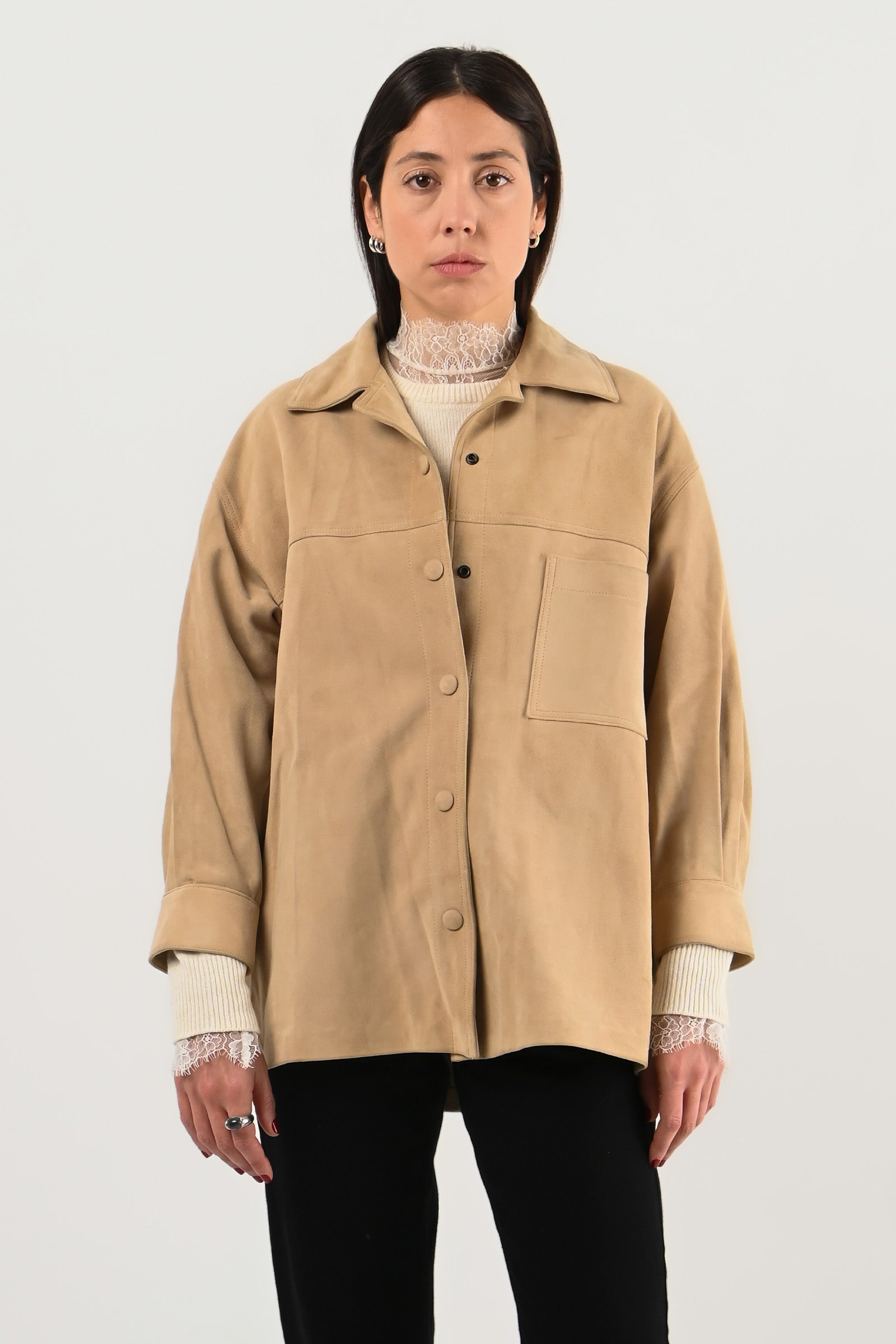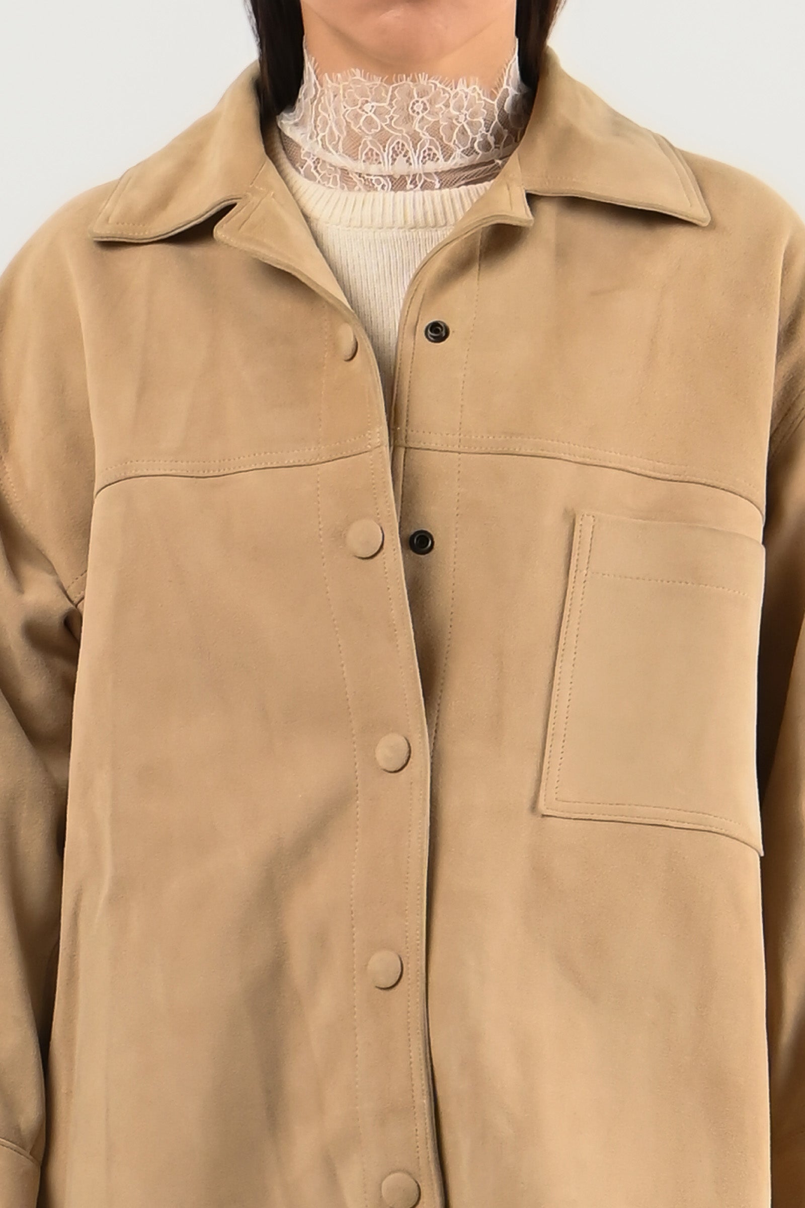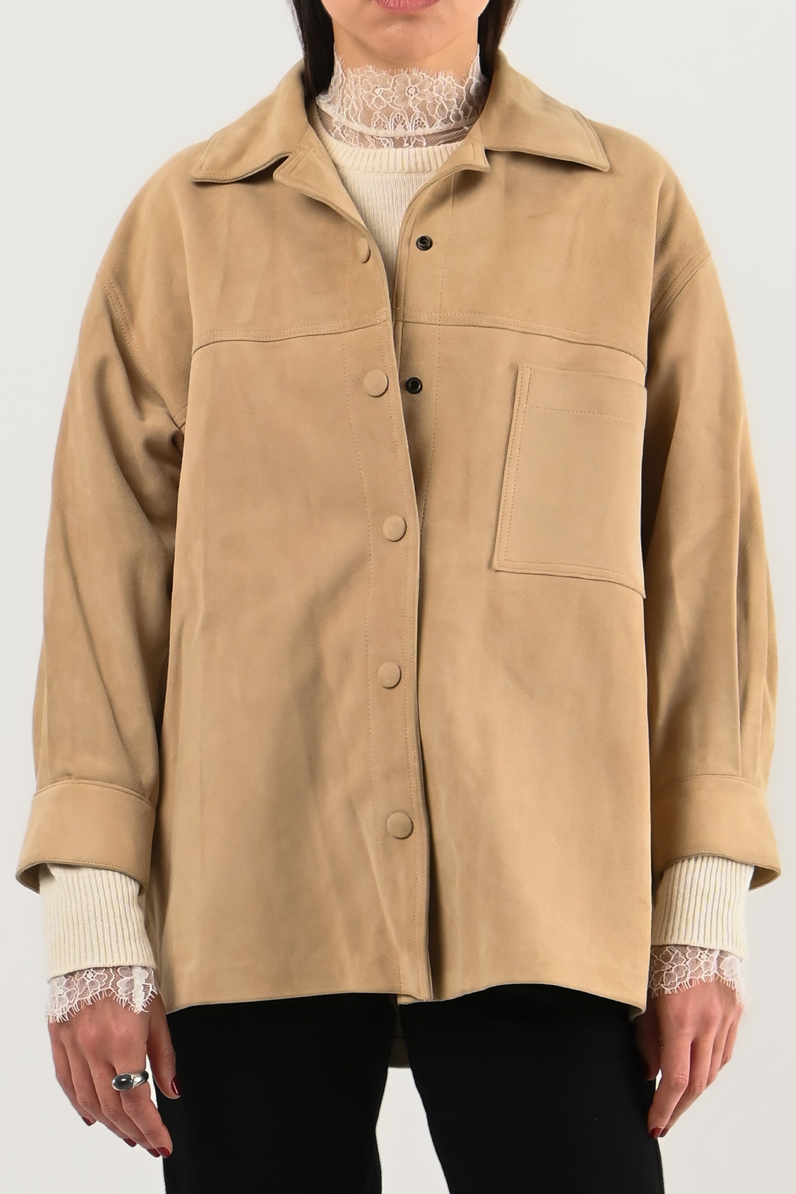 Surchemise en agneau velours beige souple, boutonnée sur le devant avec poche plaquée. Pièce emblématique du savoir-faire cuir de Jitrois, années 80-90.