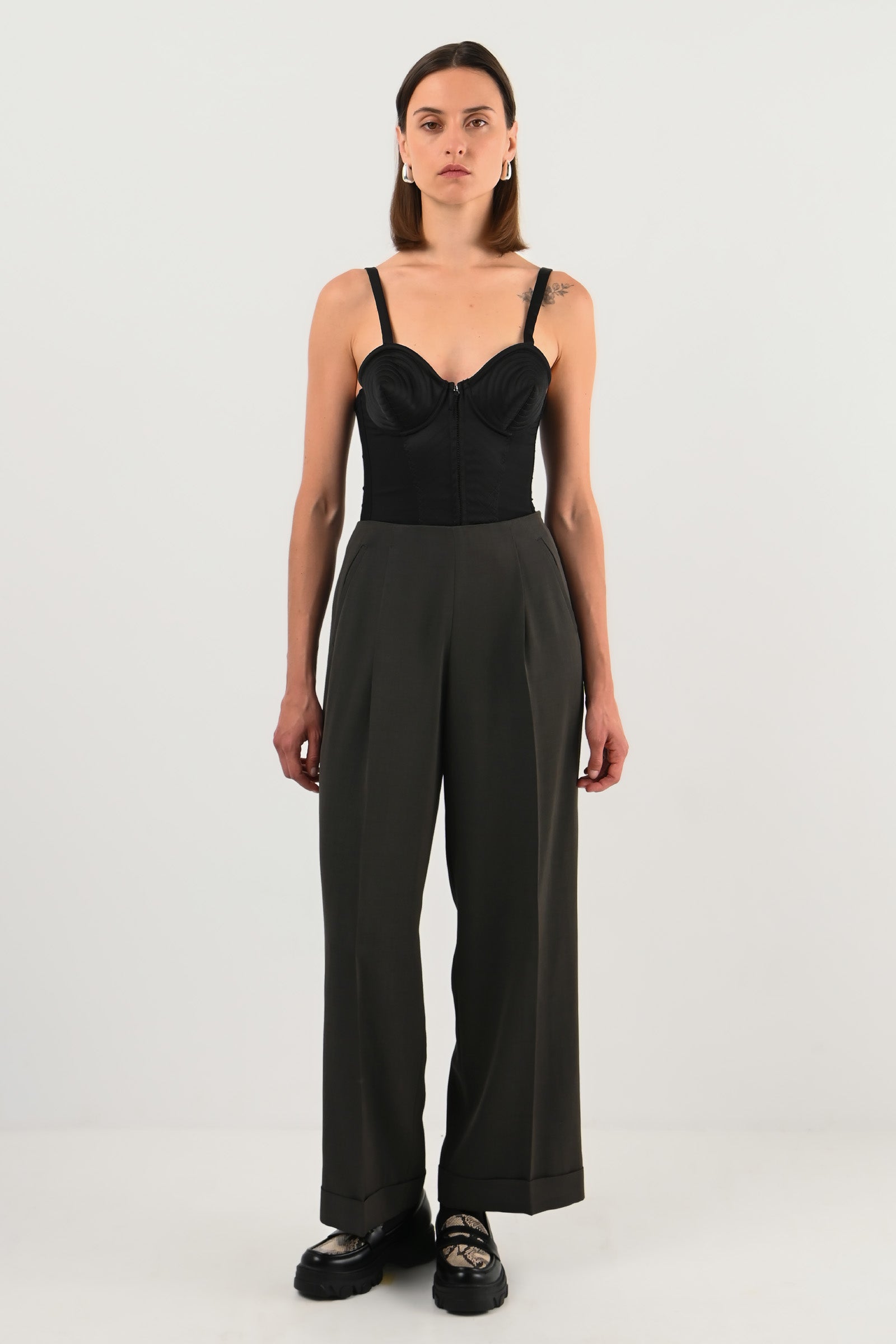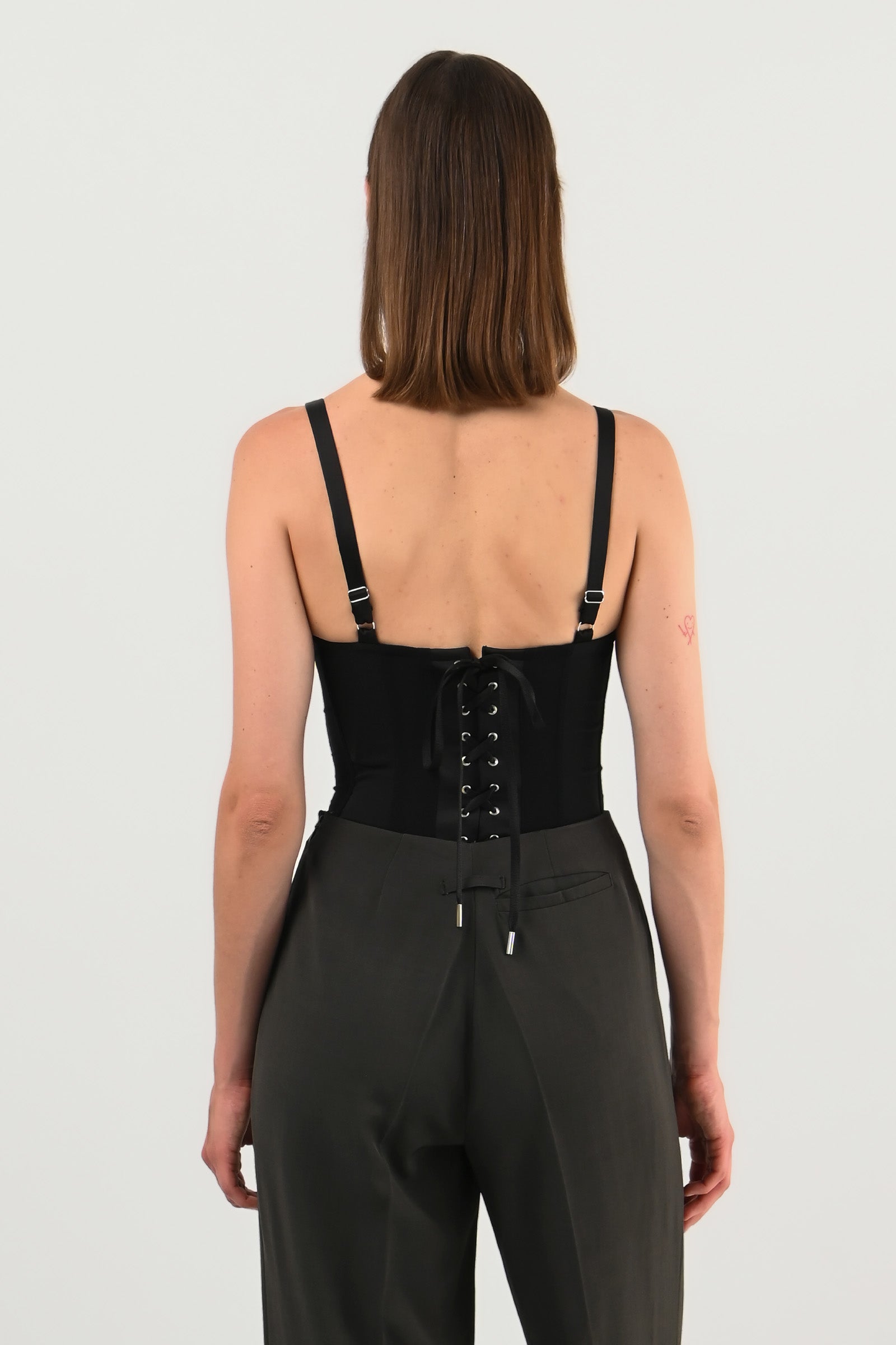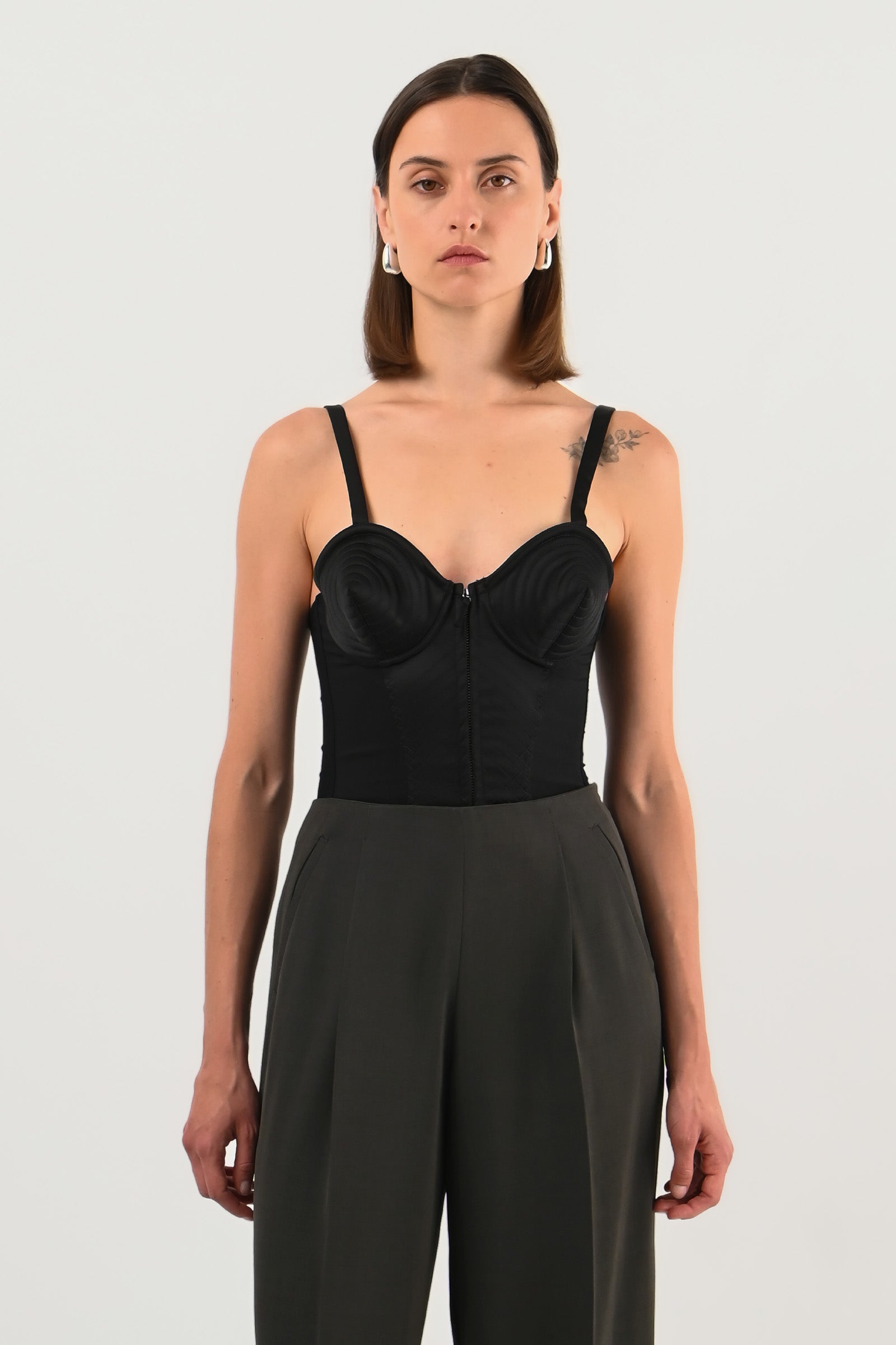 Body noir structuré avec zip central, bonnets coniques et laçage dos. Réédition années 1990, pièce iconique de l’héritage corsetier Gaultier.