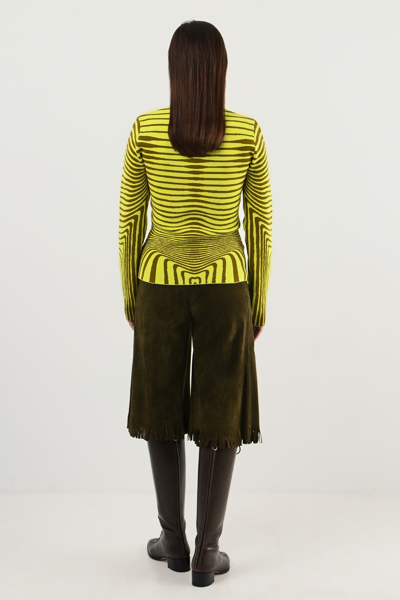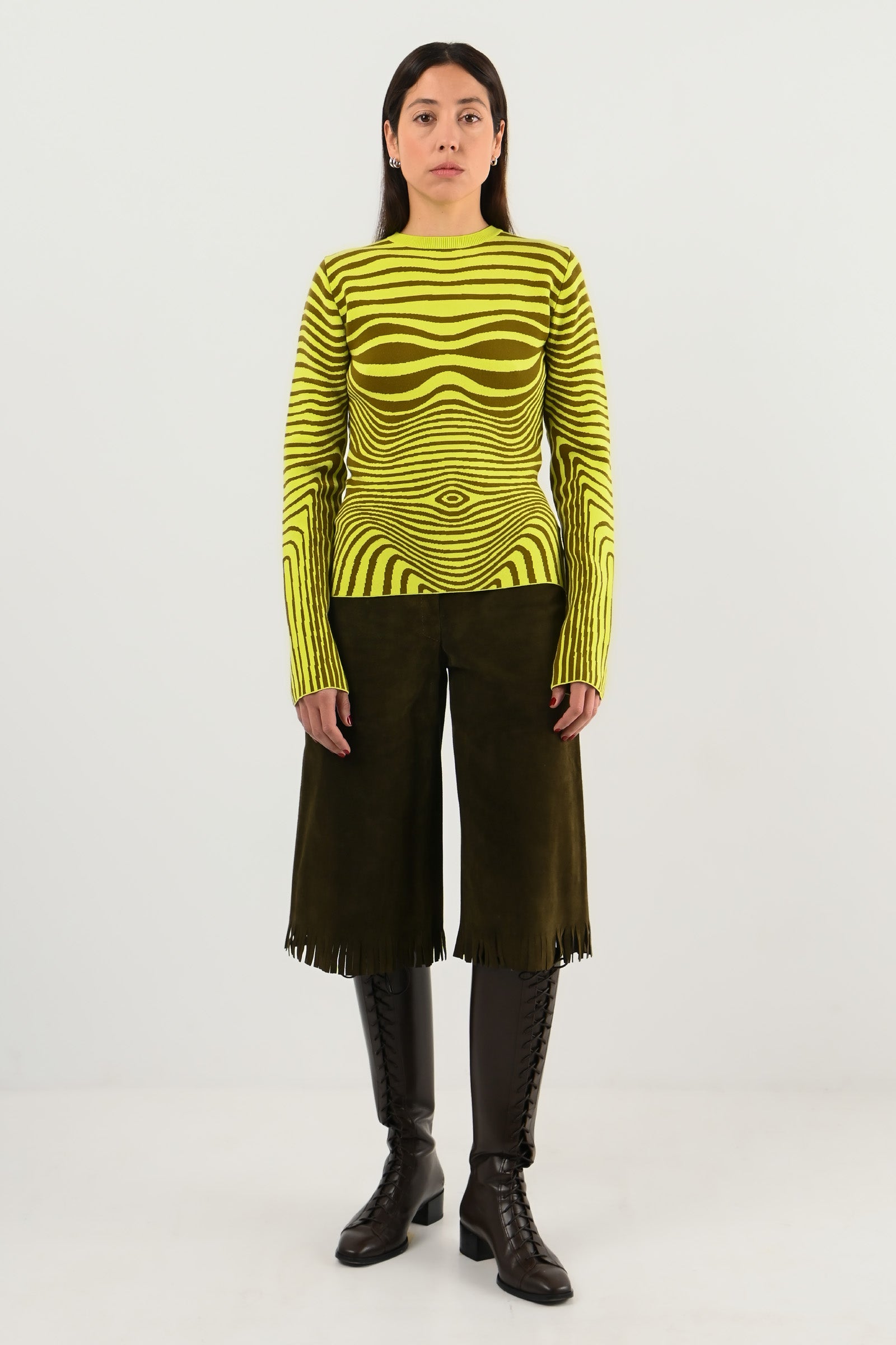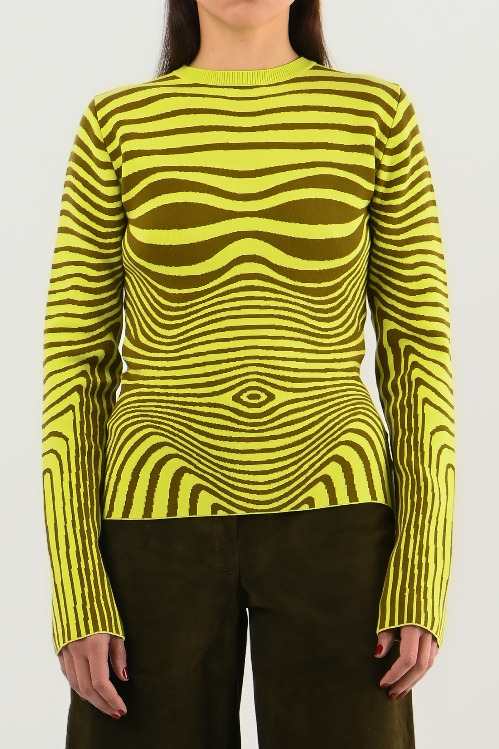 Pull seconde peau, imprimé trompe-l’œil “bois”.