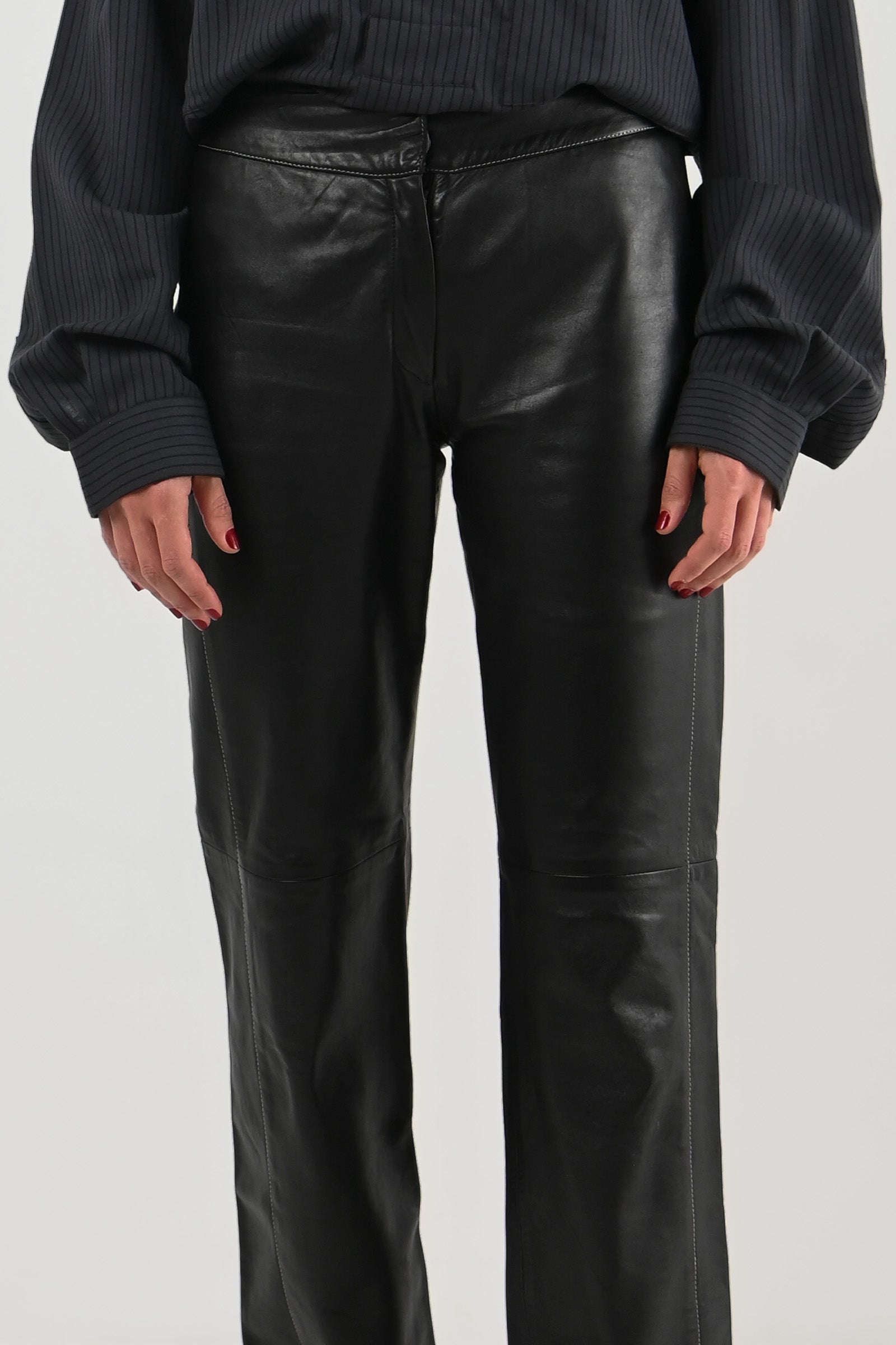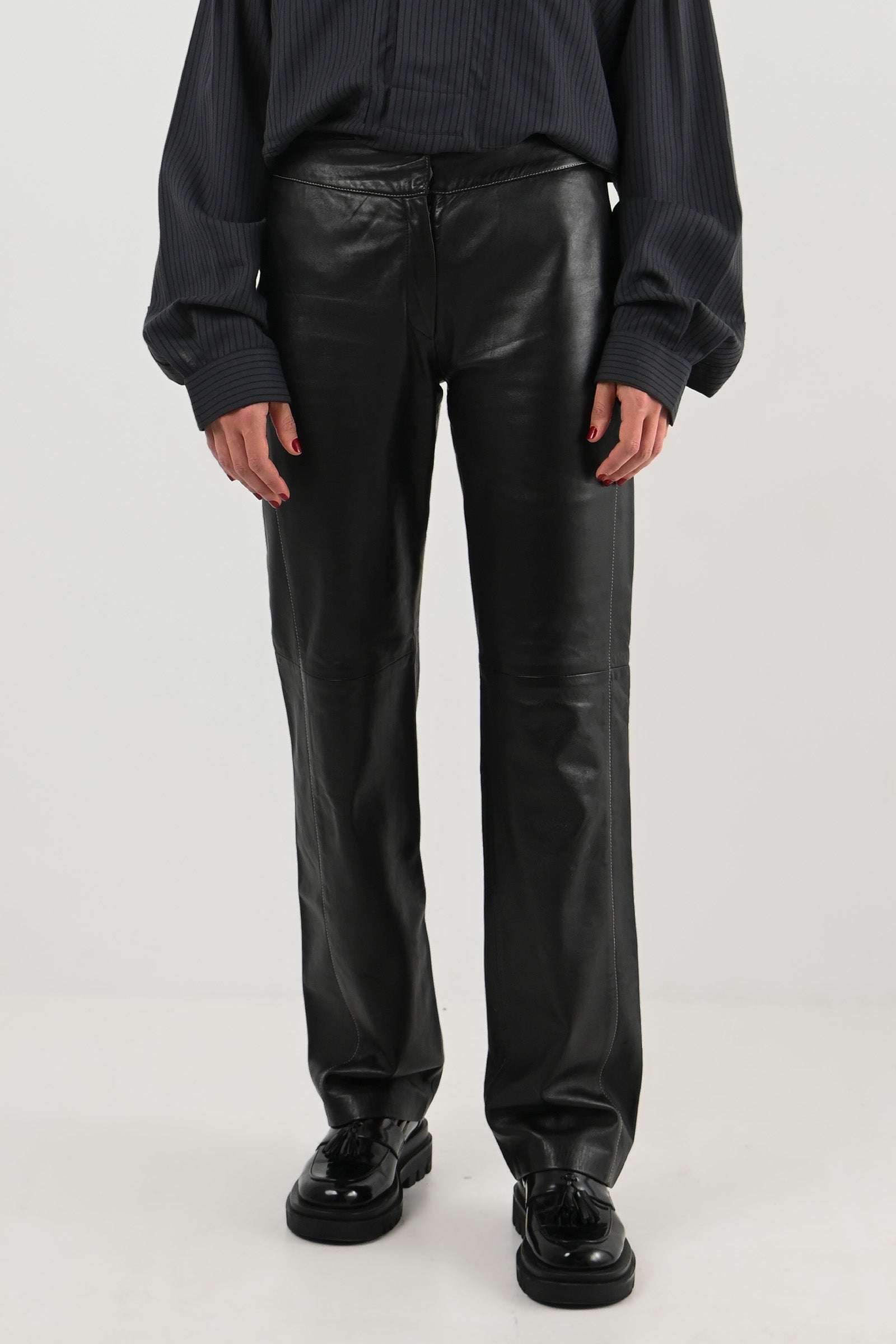 Pantalon en cuir noir lisse, coupe droite et structurée, doublure imprimée.