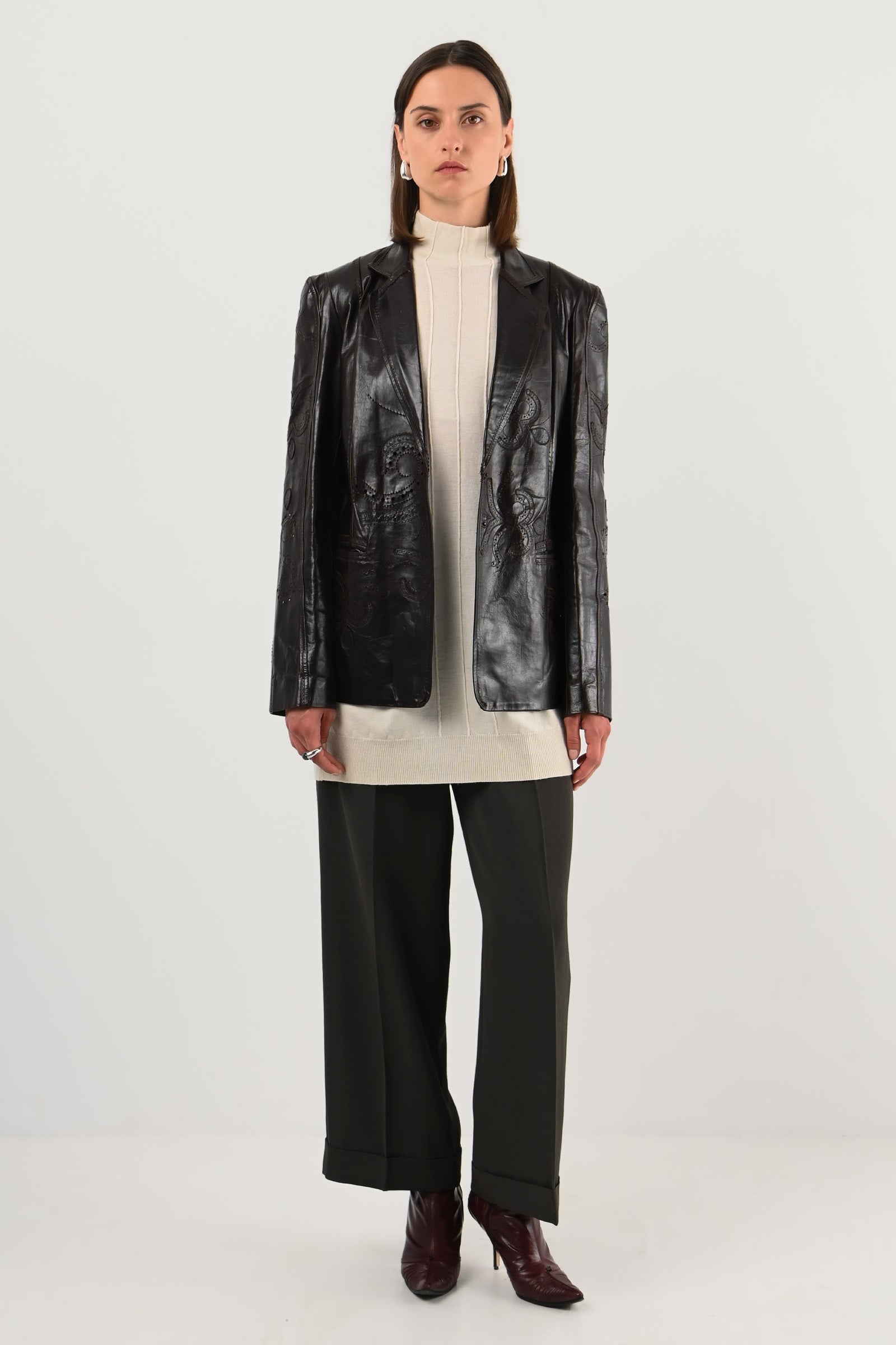 Détails : cuir perforé floral et géométrique, coupe cintrée, épaules structurées, surpiqûres