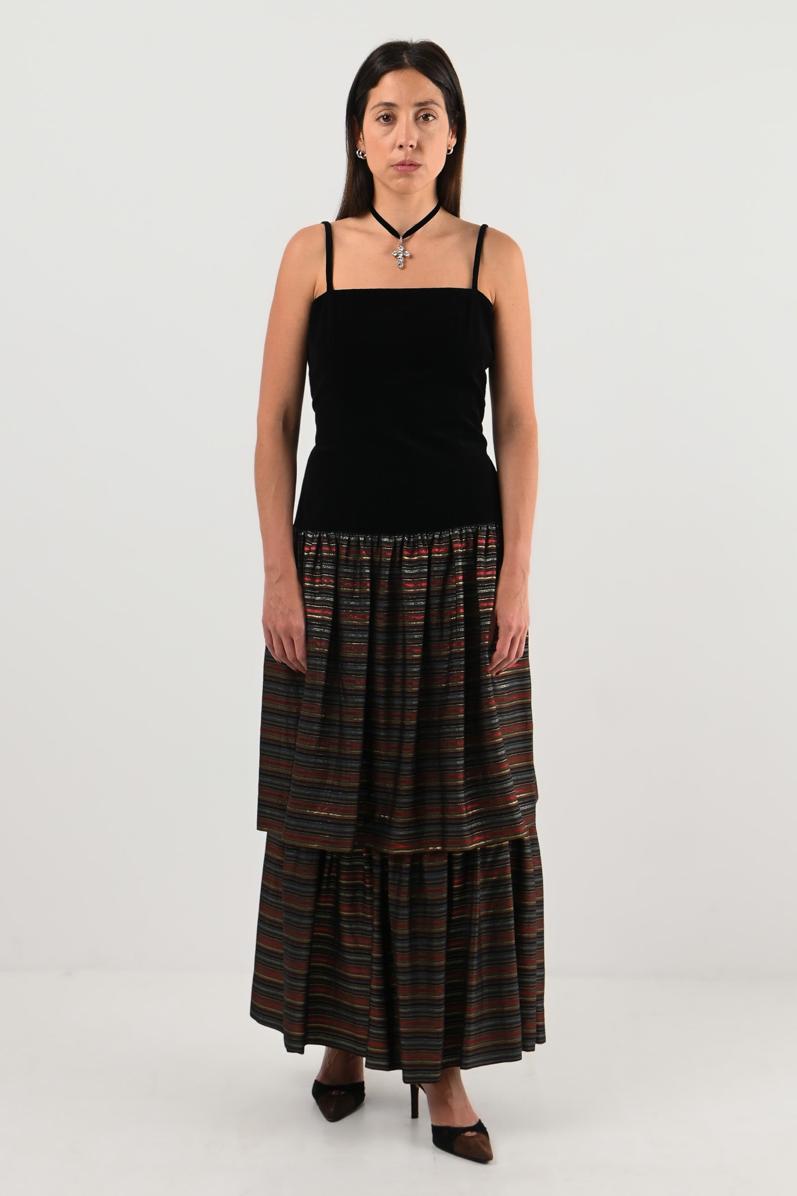 Robe à fines bretelles constituée de deux parties : un haut en velours noir lisse et un jupe à double étage en taffetas rayé métallisé. Contraste élégant entre velours profond et reflets irisés.