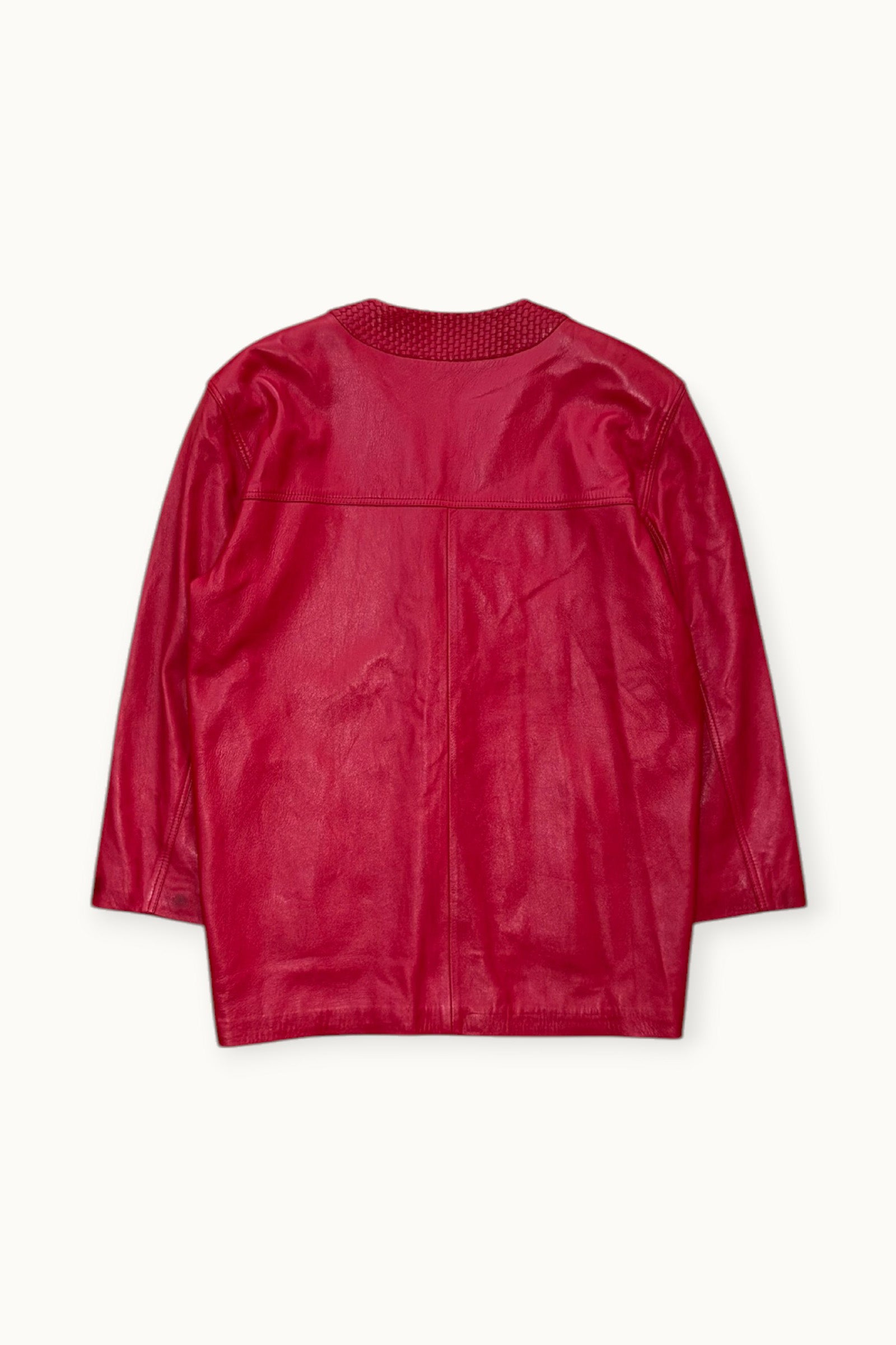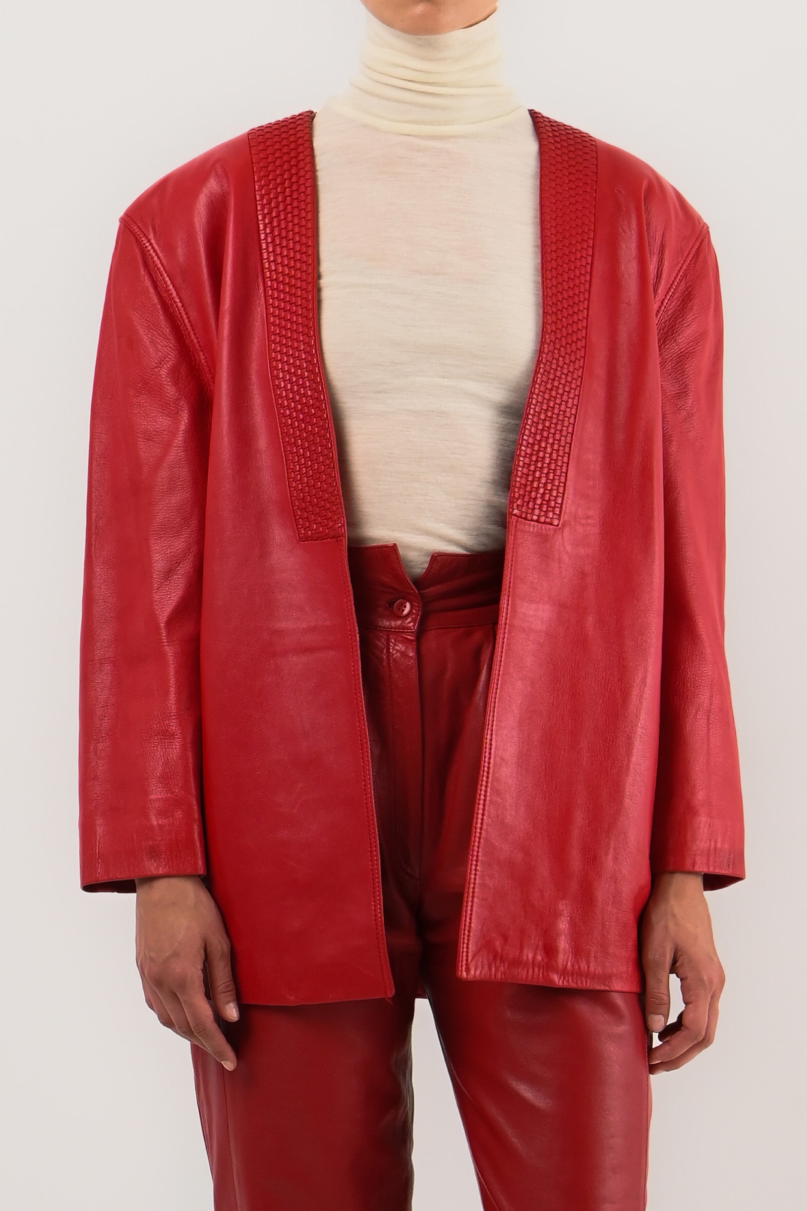 Veste droite en cuir d’agneau rouge, détail tressé au col et sur les devants, coupe ouverte sans boutonnage.