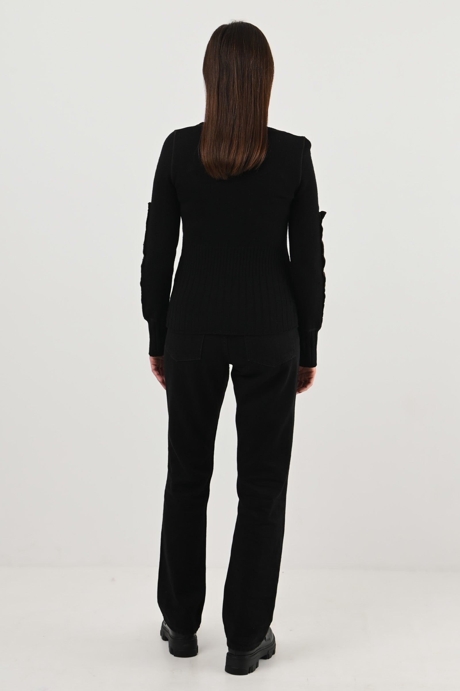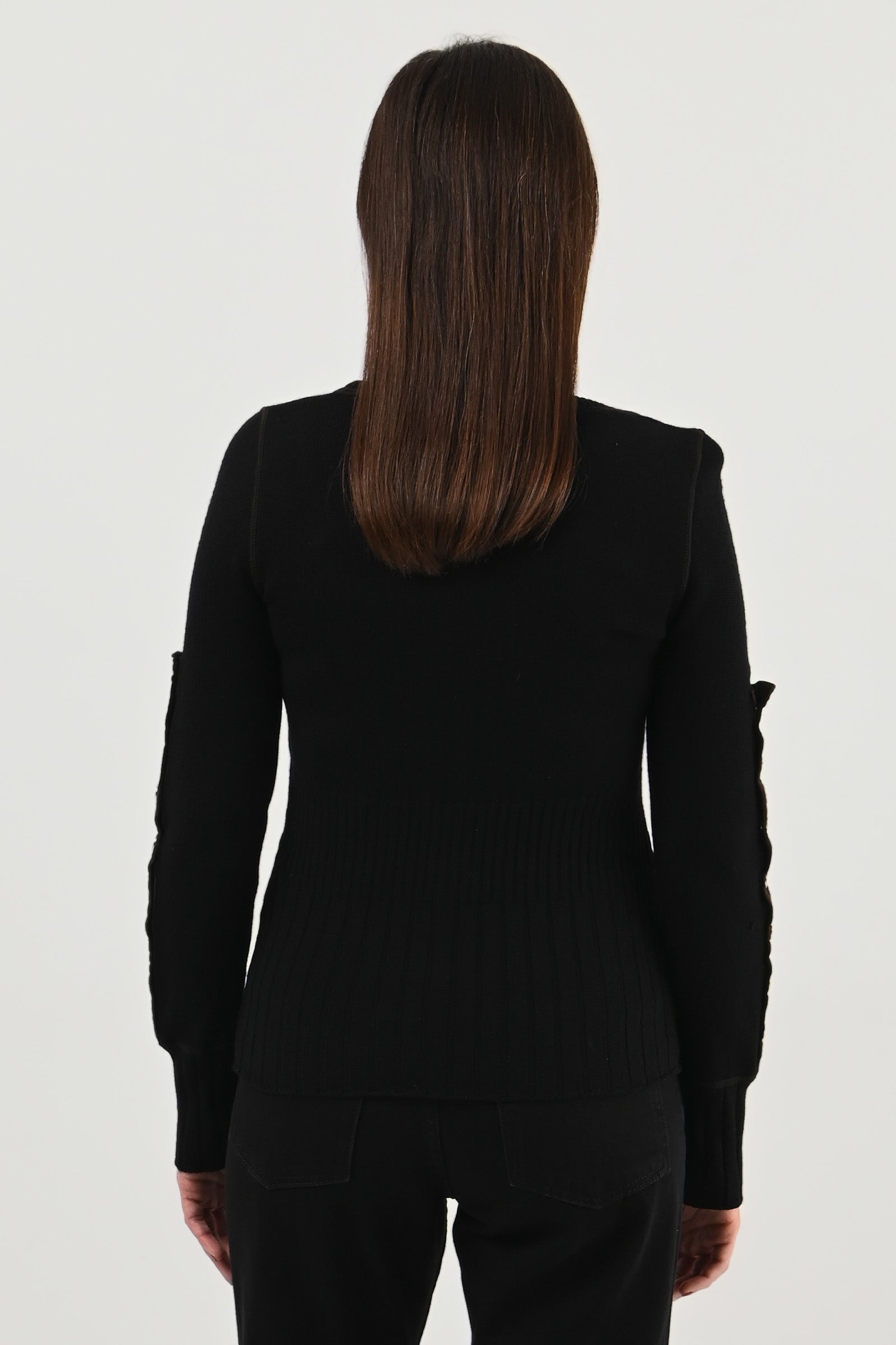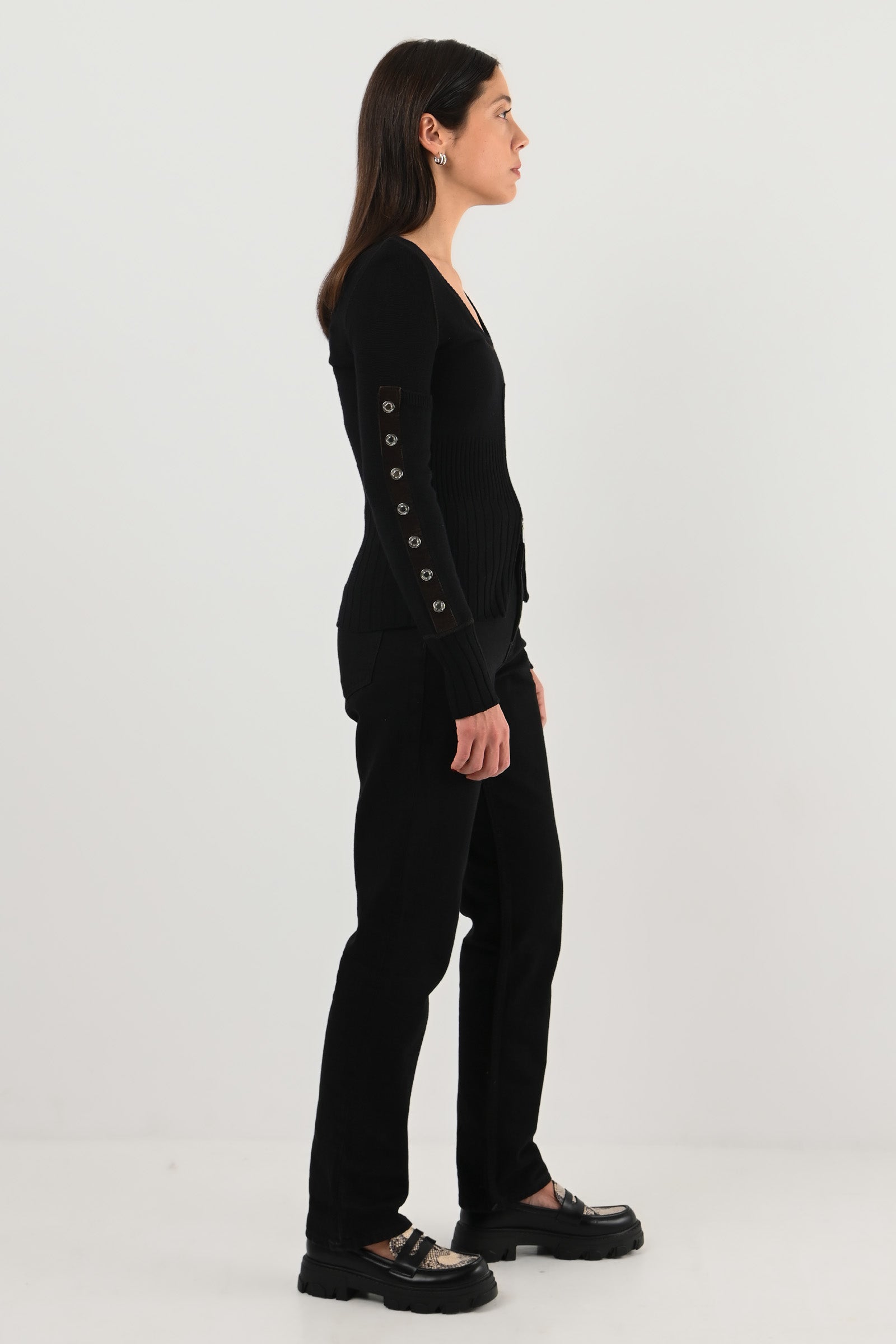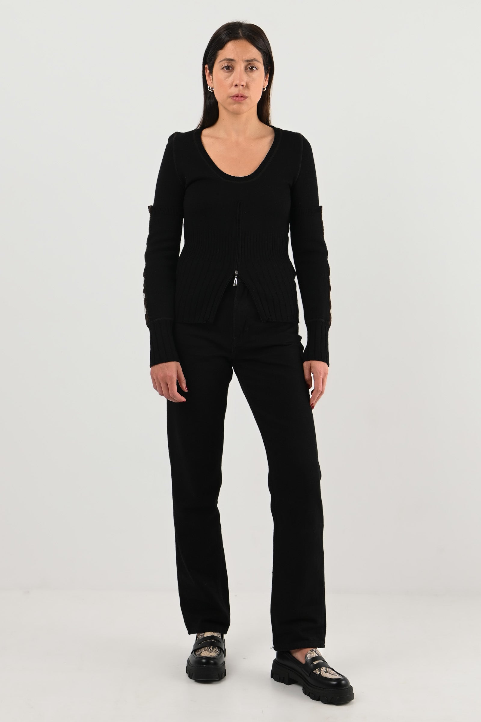 Pull en laine ajusté, encolure dégagée, manches ornées d’empiècements en suédine avec boutons métalliques embossés. Zip au bas.