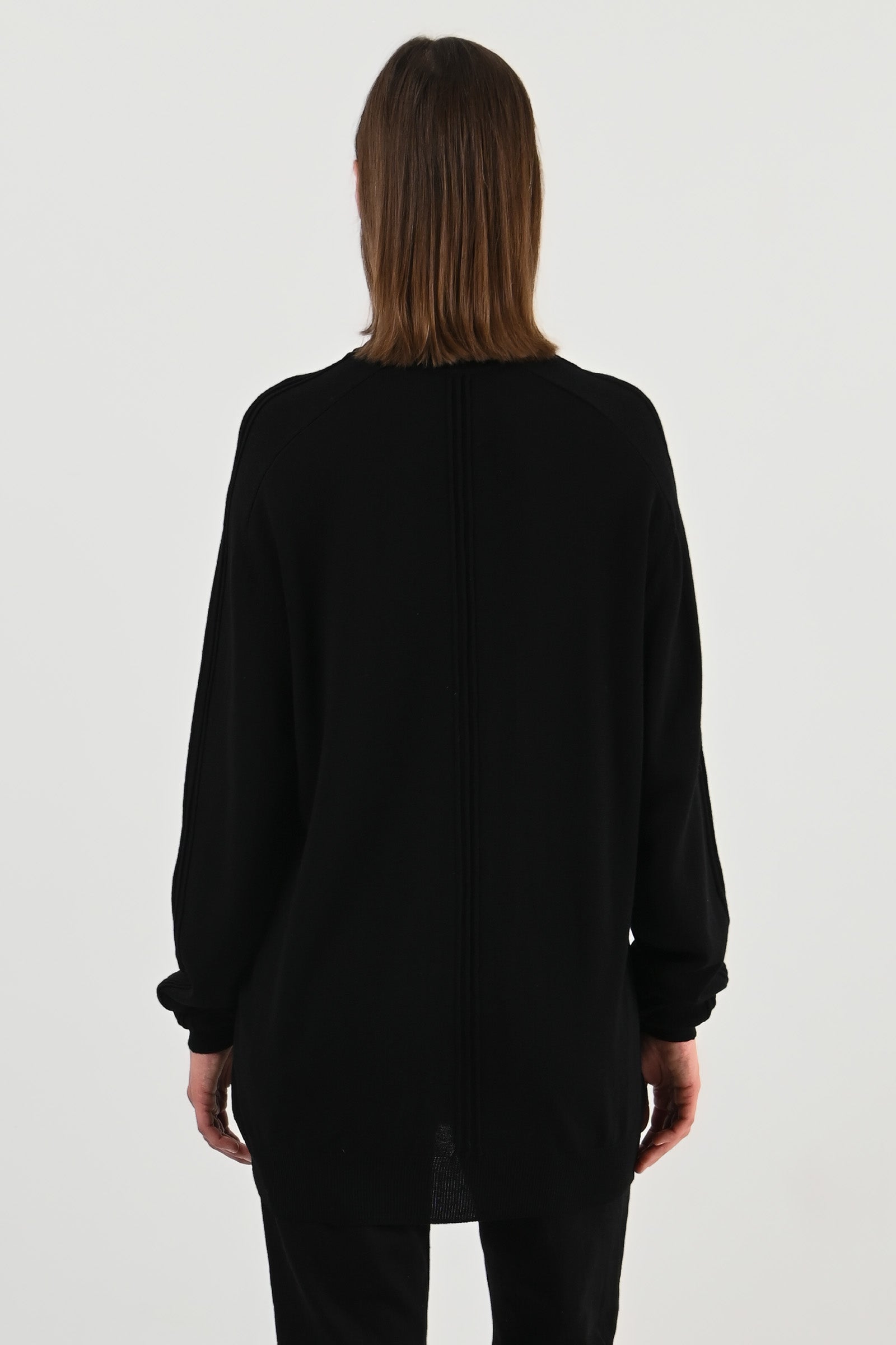 Polo noir en 100 % laine vierge, col structuré et boutons-pression métalliques.