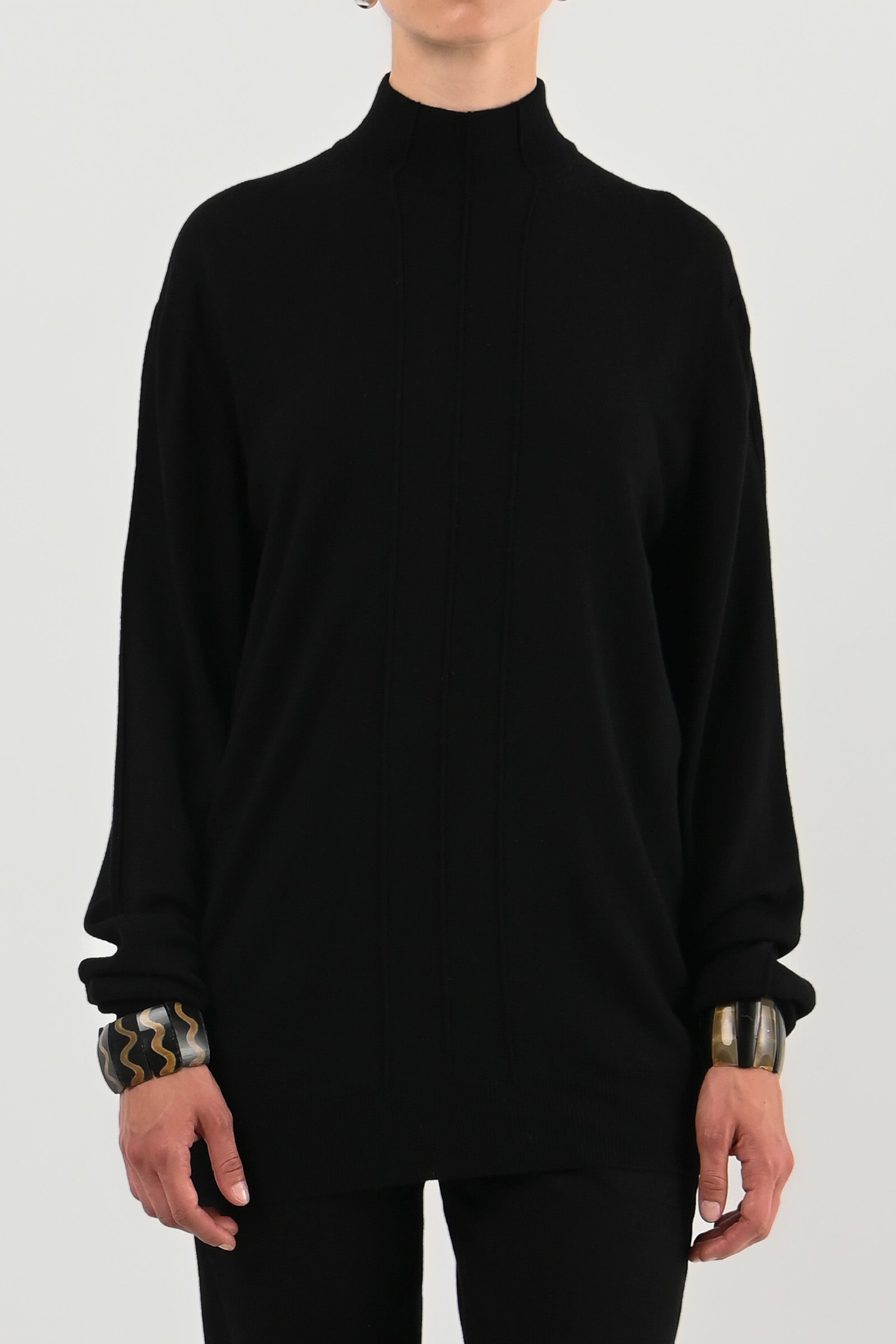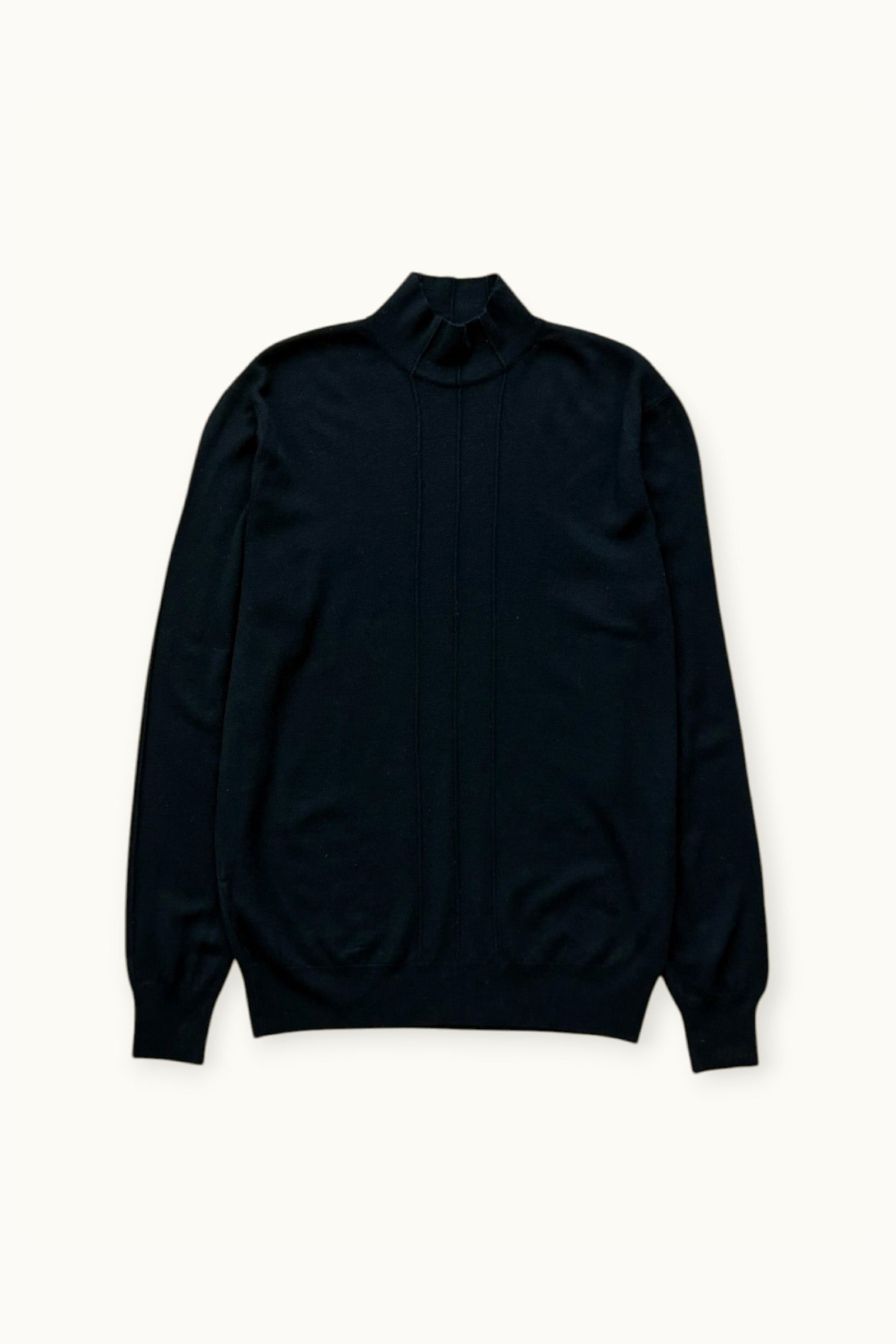 Pull noir en 100 % laine vierge, col montant structuré et coutures verticales apparentes.