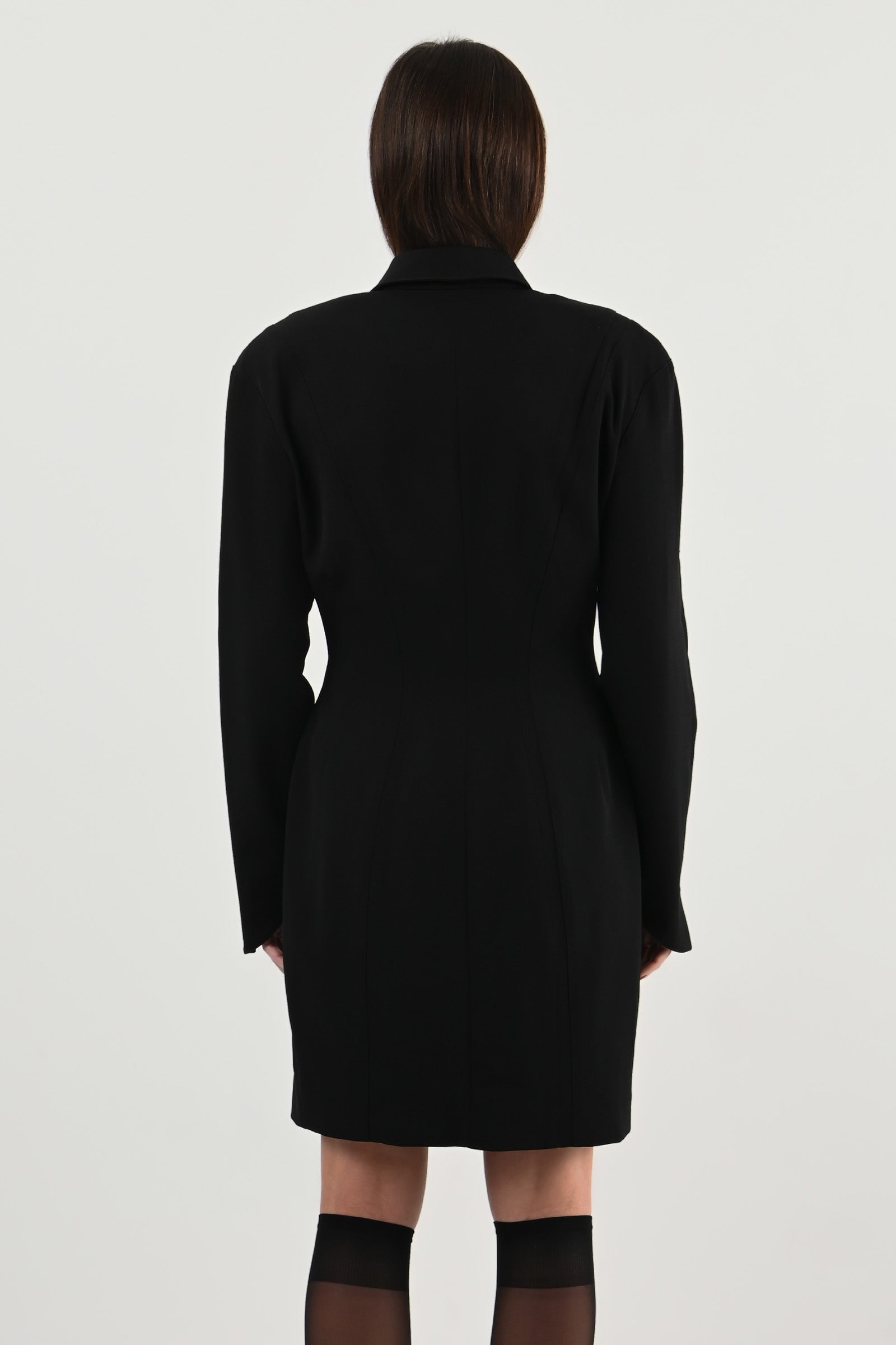 Robe blazer noire à épaules affirmées, taille cintrée et coupe architecturée. Zip métallique signature et col pointu, typiques de l’esthétique Mugler.