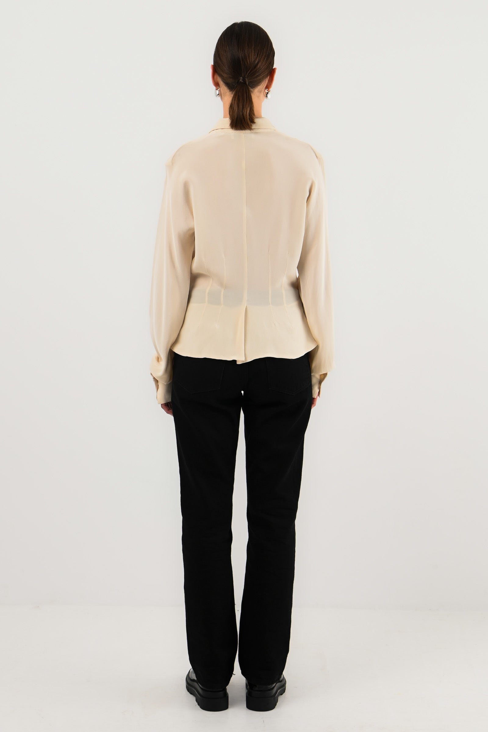 Chemise en 100 % soie, col cranté, manches bouffantes et volants plissés en cascade soulignant la taille.