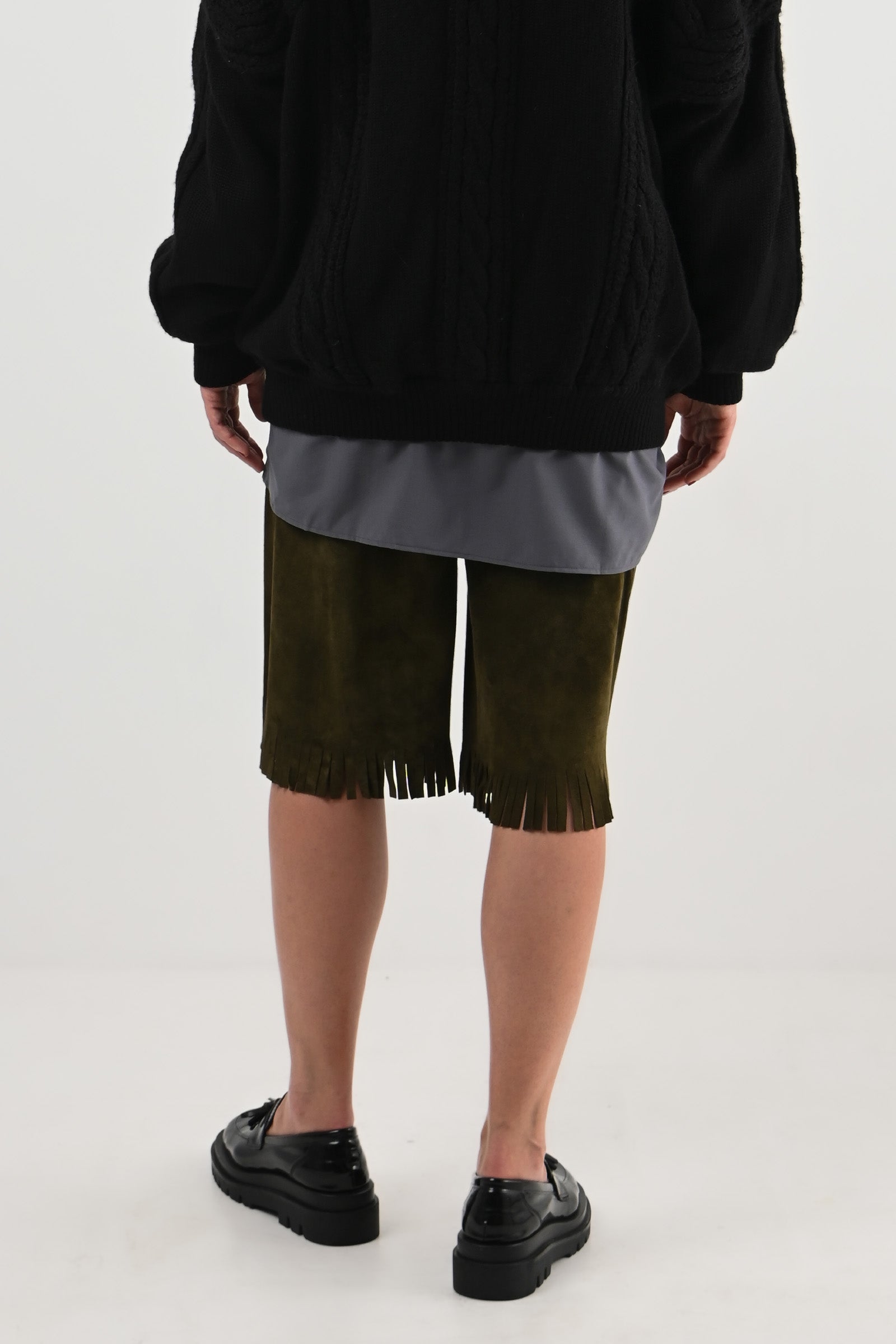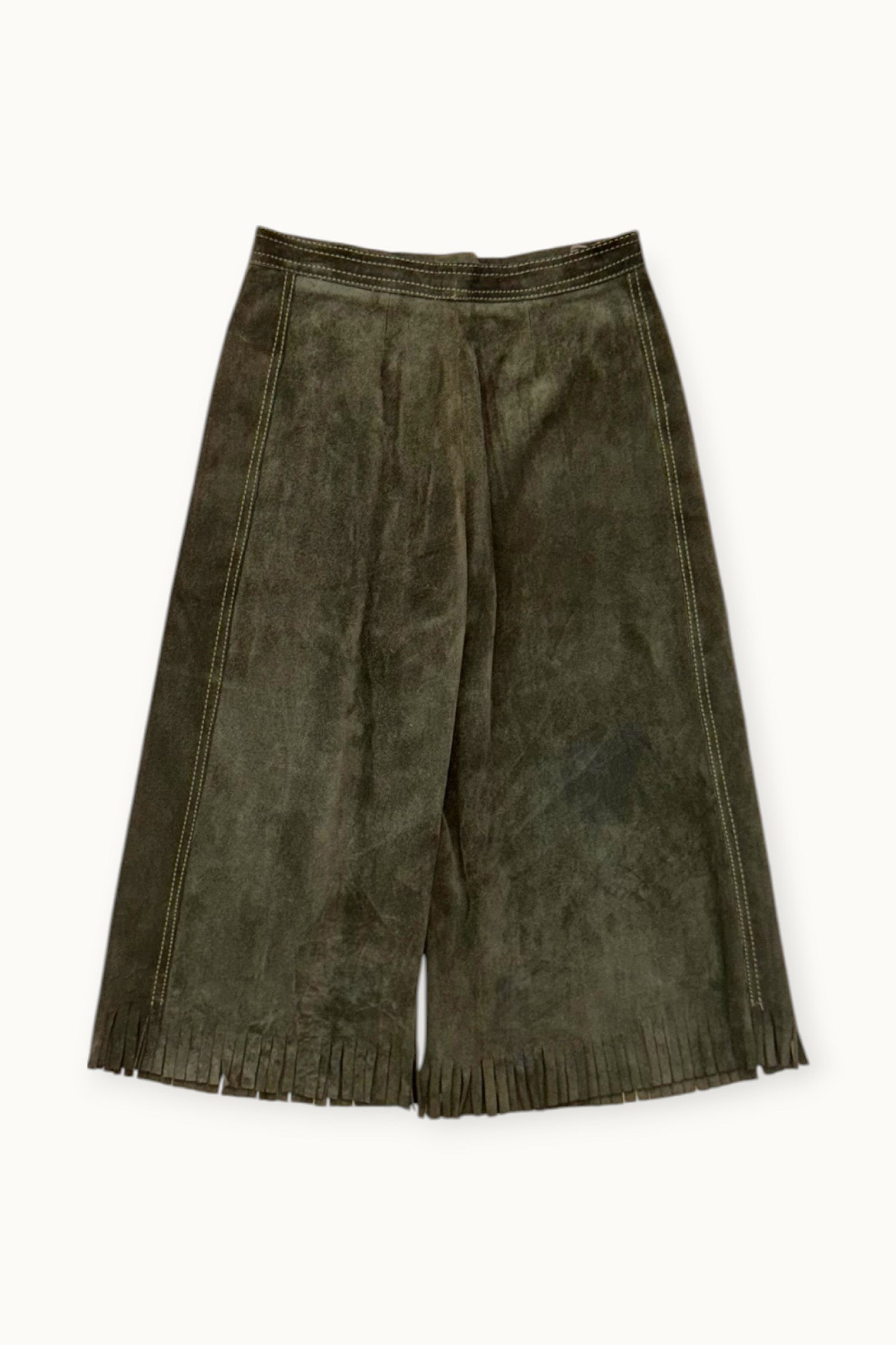 Bermuda ample en daim vert olive, terminé par des franges à l’ourlet. Pièce rare du vestiaire Rive Gauche.